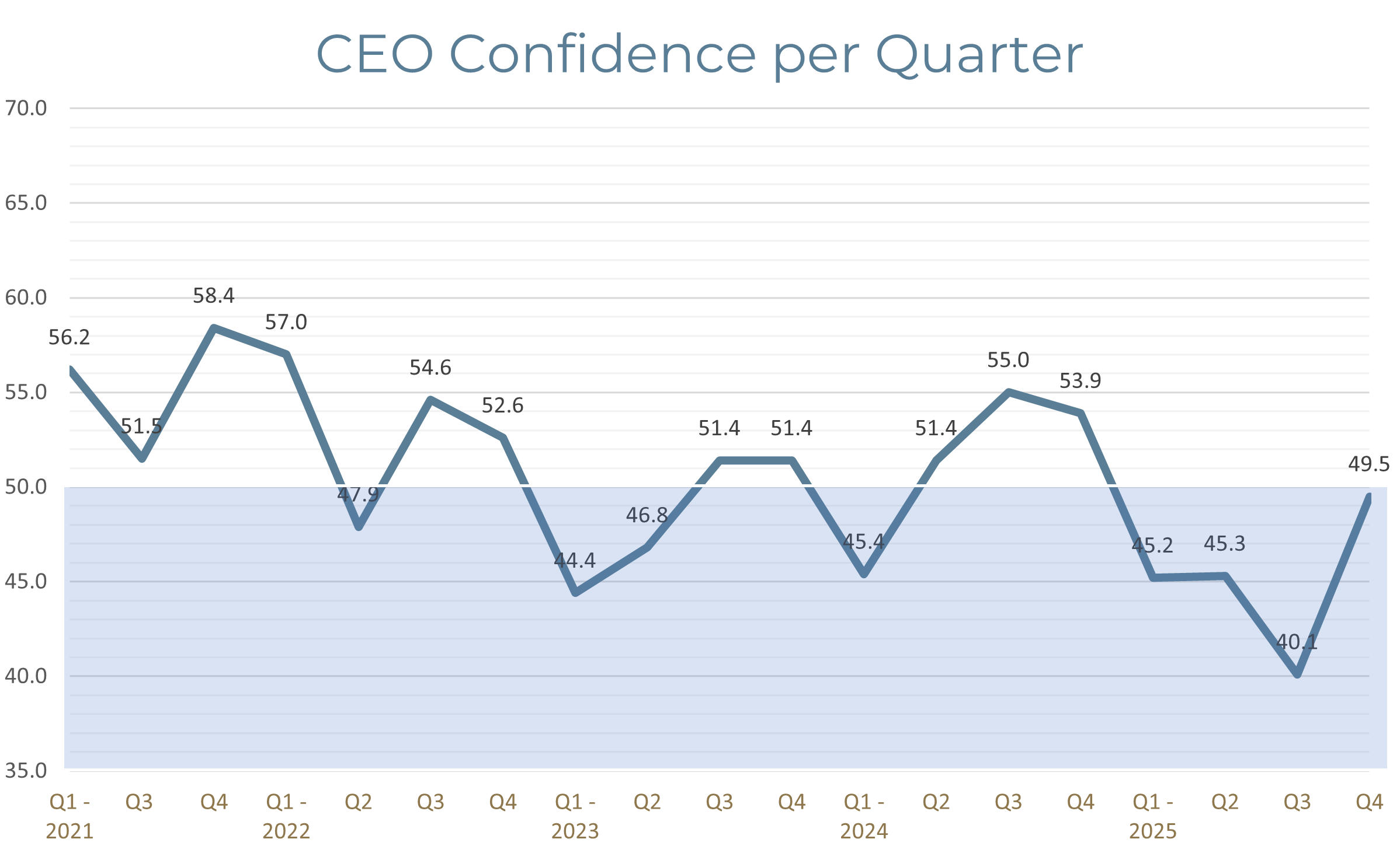 Industrials climbed to 59.3, reflecting resilience and increased project activity. CEOs pointed to better-than-expected demand in several sub-sectors and noted that investment sentiment has strengthened as supply chain disruptions eased.