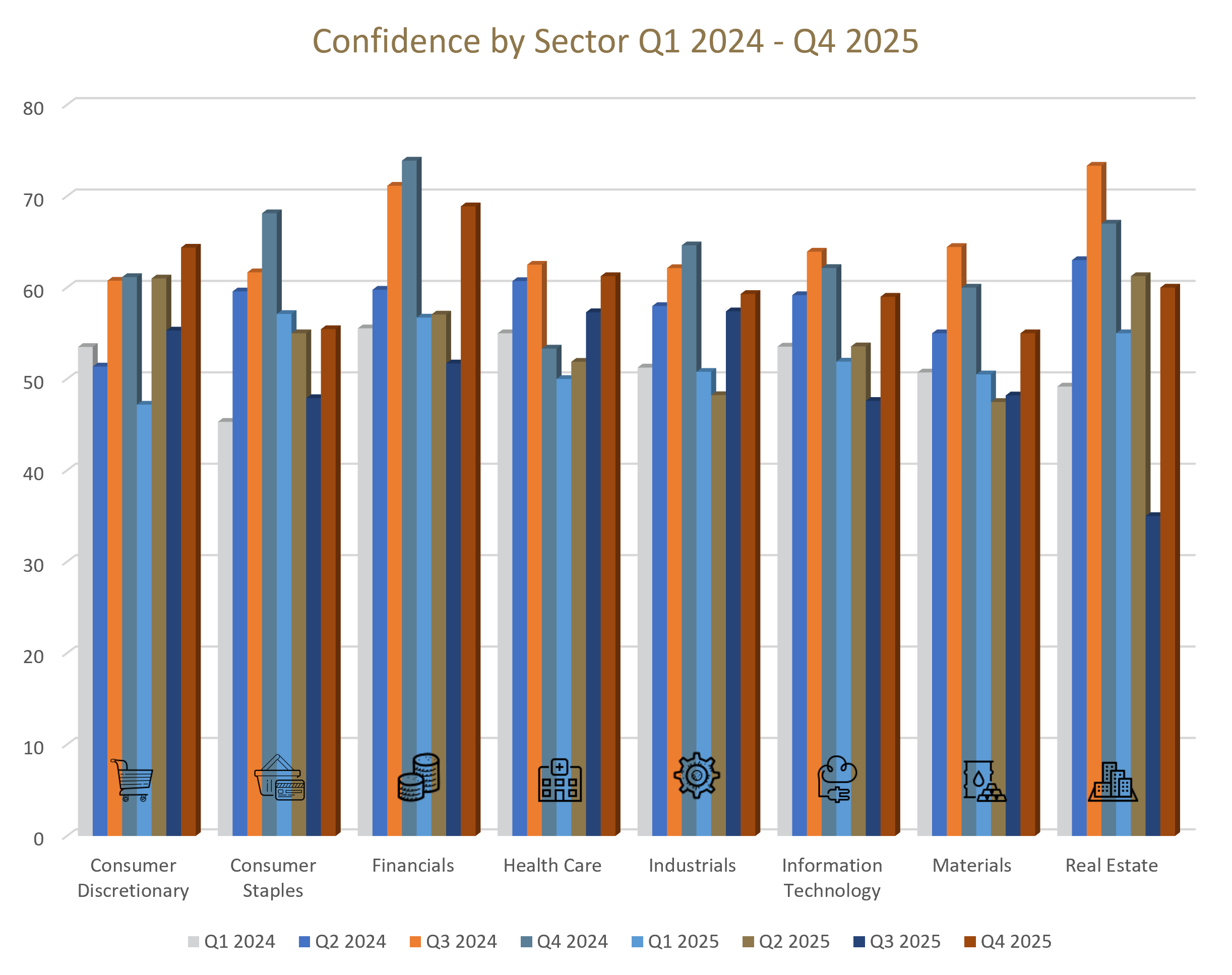 Consumer Discretionary rebounded to 64.4 in Q4. CEOs reported stronger investment sentiment and a pickup in consumer demand, though some caution remains around costs and competition. The sector ends the year on a more optimistic note.